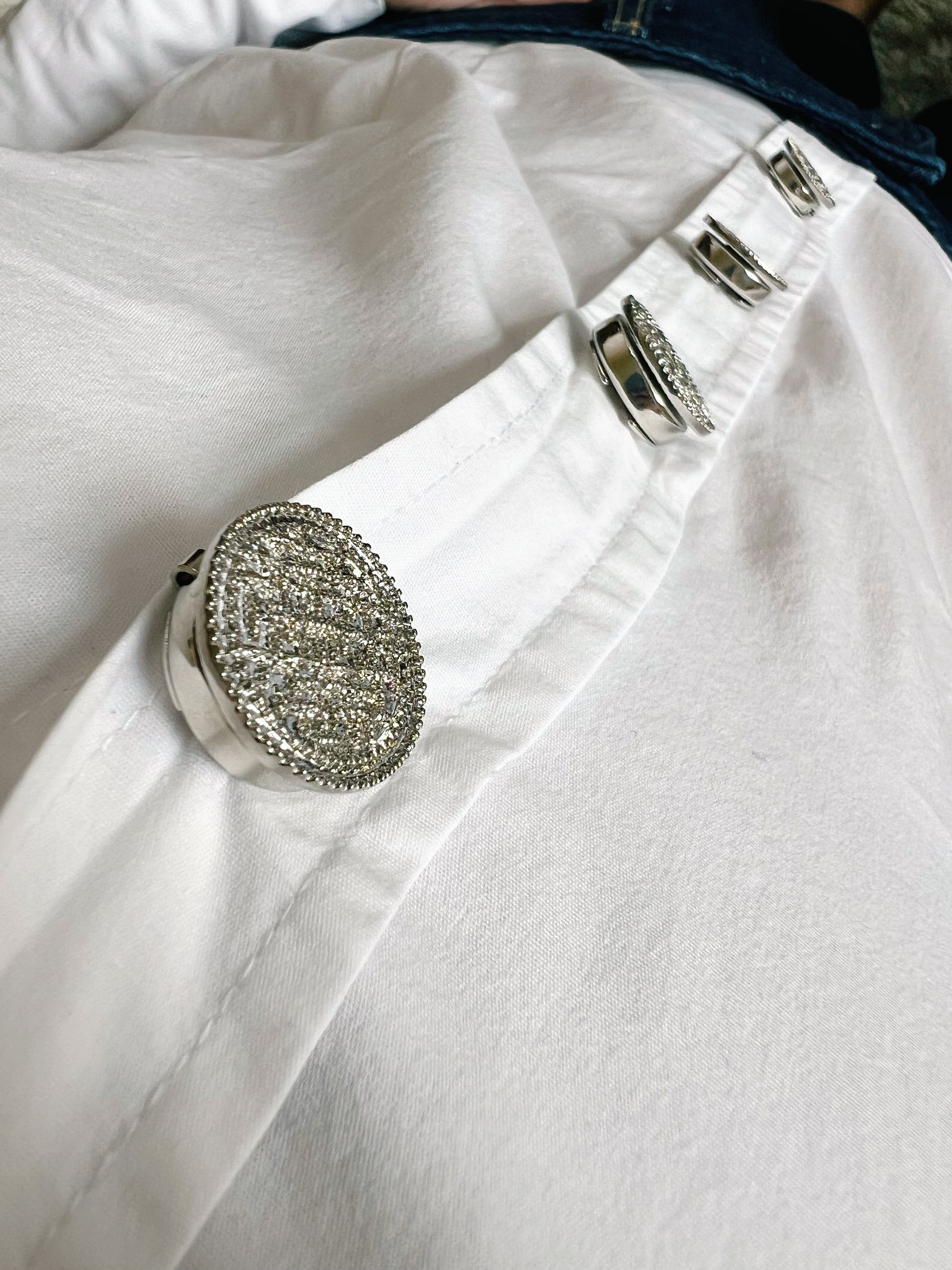 A timeless button cover with a structured finish that adds understated elegance to any outfit. Click it over a regular button (up to 13 mm in diameter) and elevate your style in seconds.