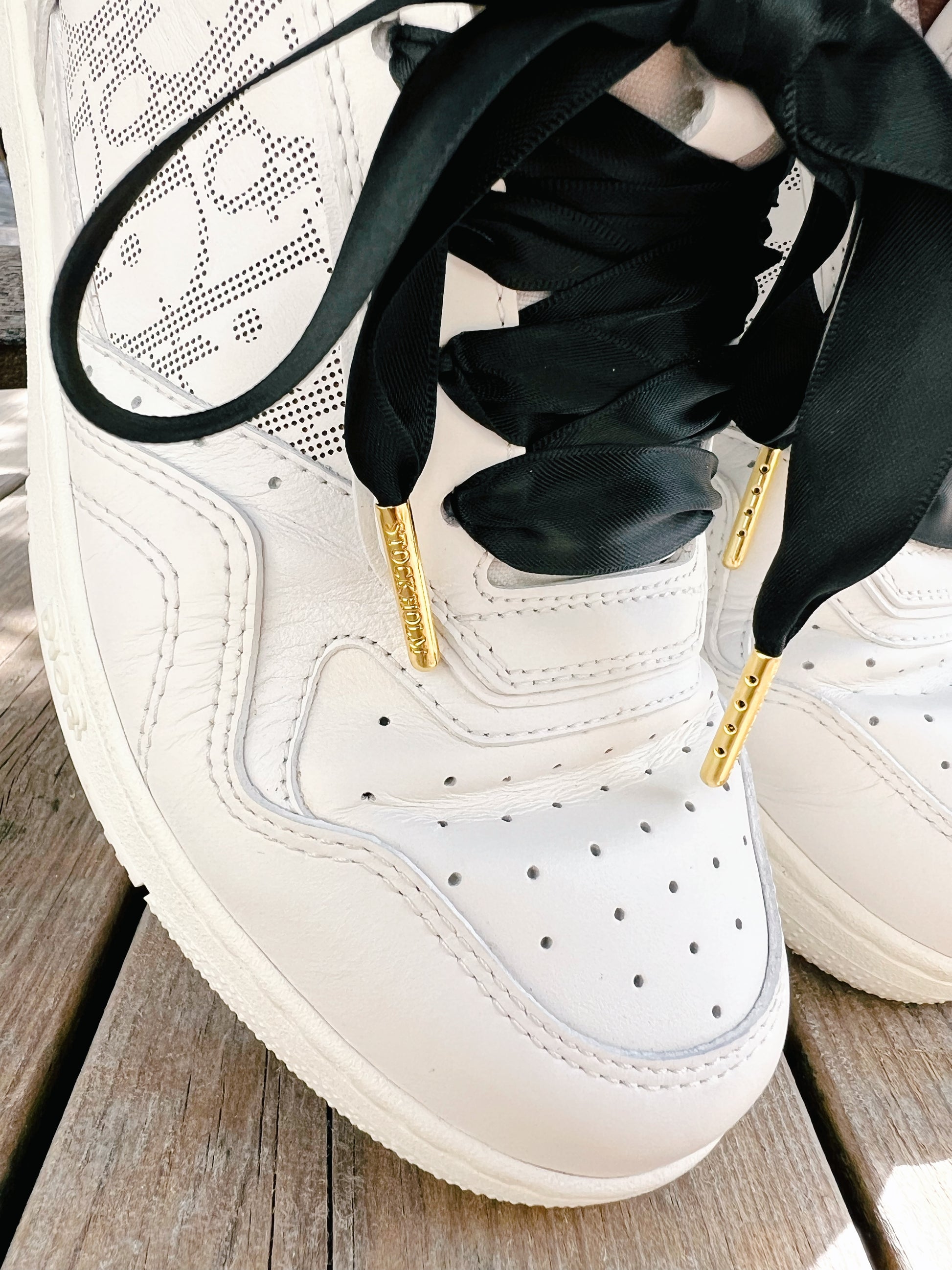 By popular demand, we’ve added a new twist to our classic satin laces: gold tips. The Black Satin Goldtip laces combine the sleek look of glossy black satin with the bold elegance of golden aglets.