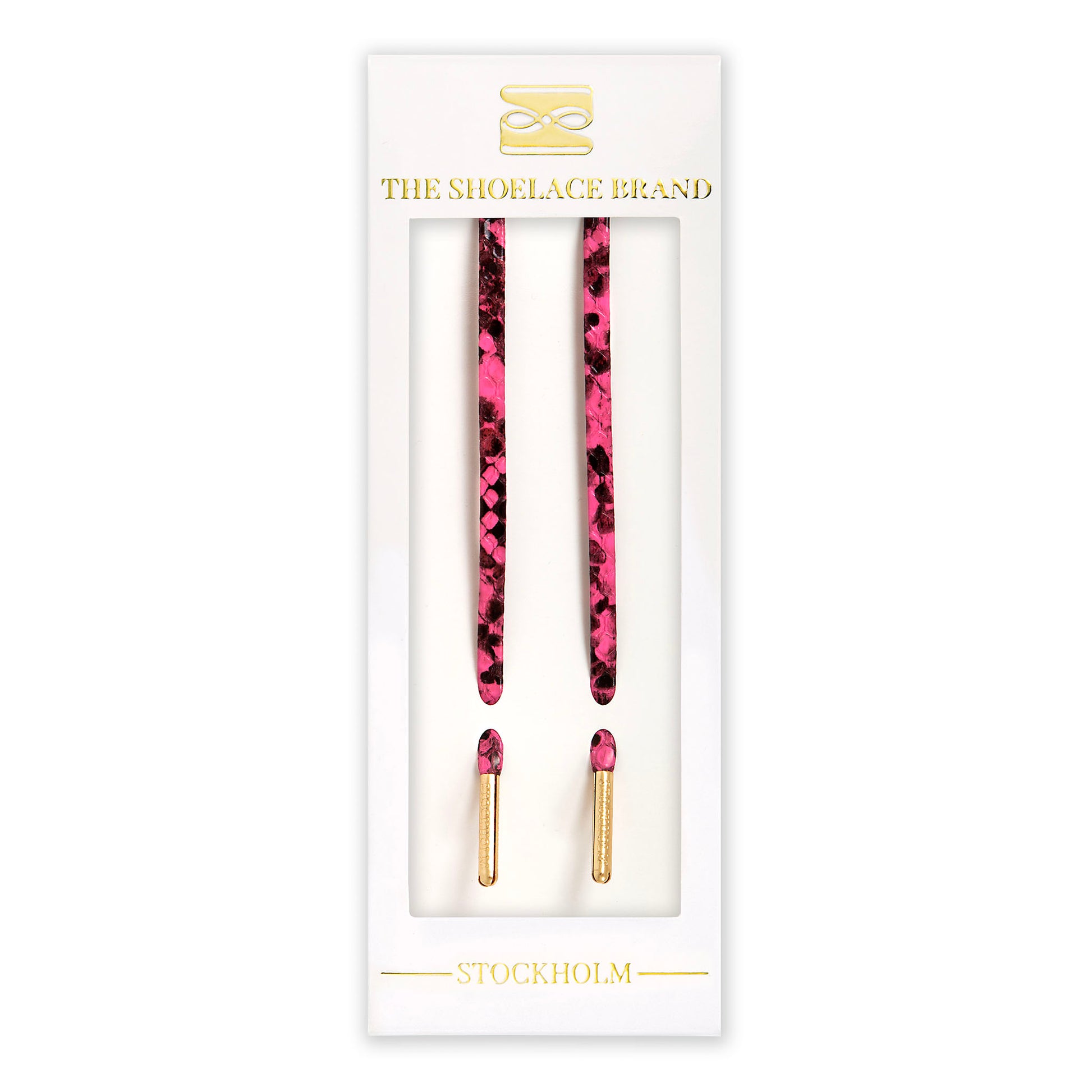 The Shoelace Brand’s pink snake print laces are designed for those who want an edgy, stylish look. Made from PU material, these laces feature a striking pink and black snake print pattern, with luxurious gold metal tips for an extra touch of sophistication.