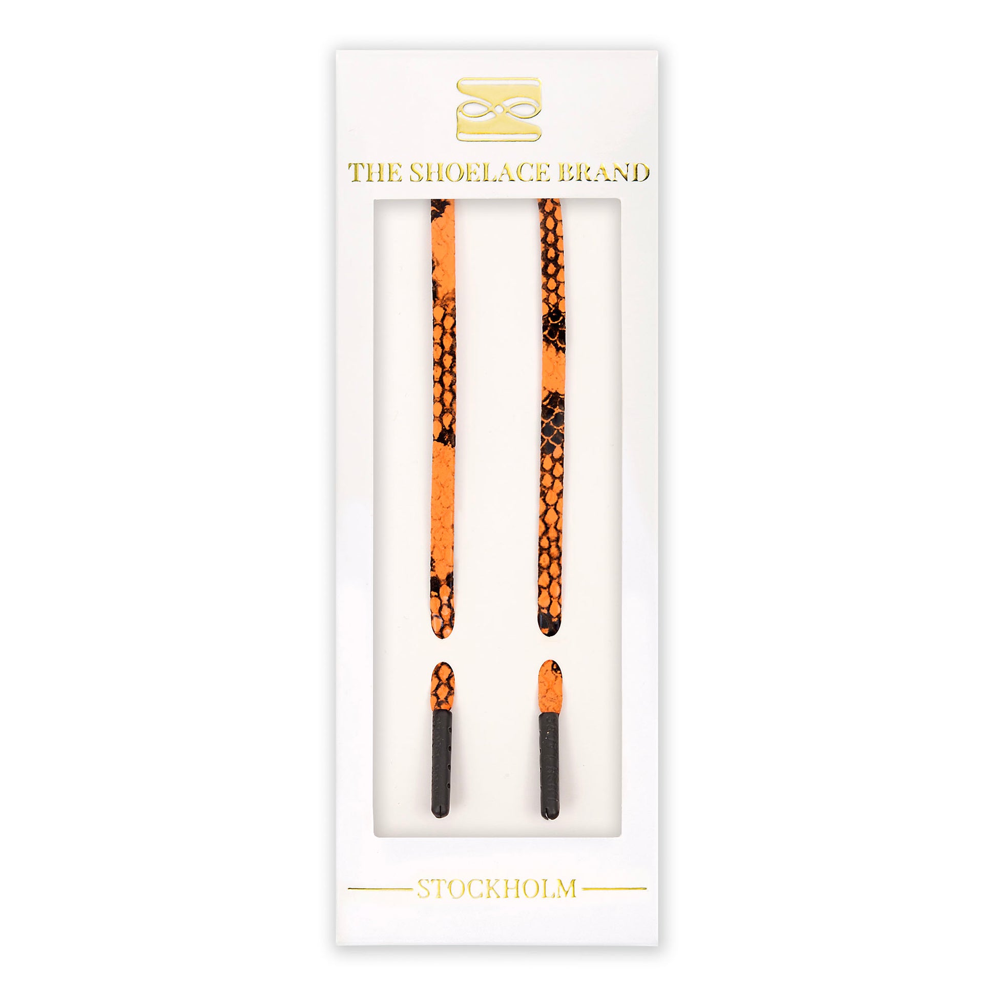 Our orange snakeskin-inspired shoelaces are designed to make a statement. Featuring an orange base with black patterning, these laces offer a dynamic look and a sleek faux-leather shine. Finished with black metal tips for that extra edge.