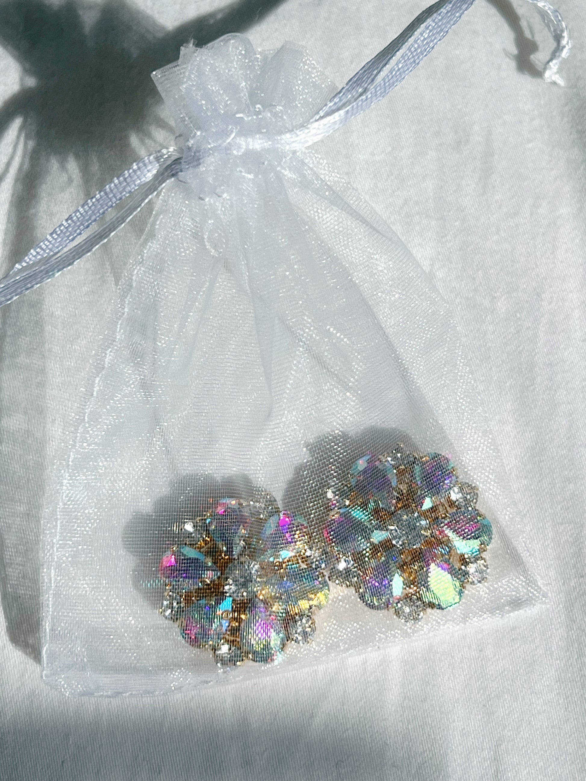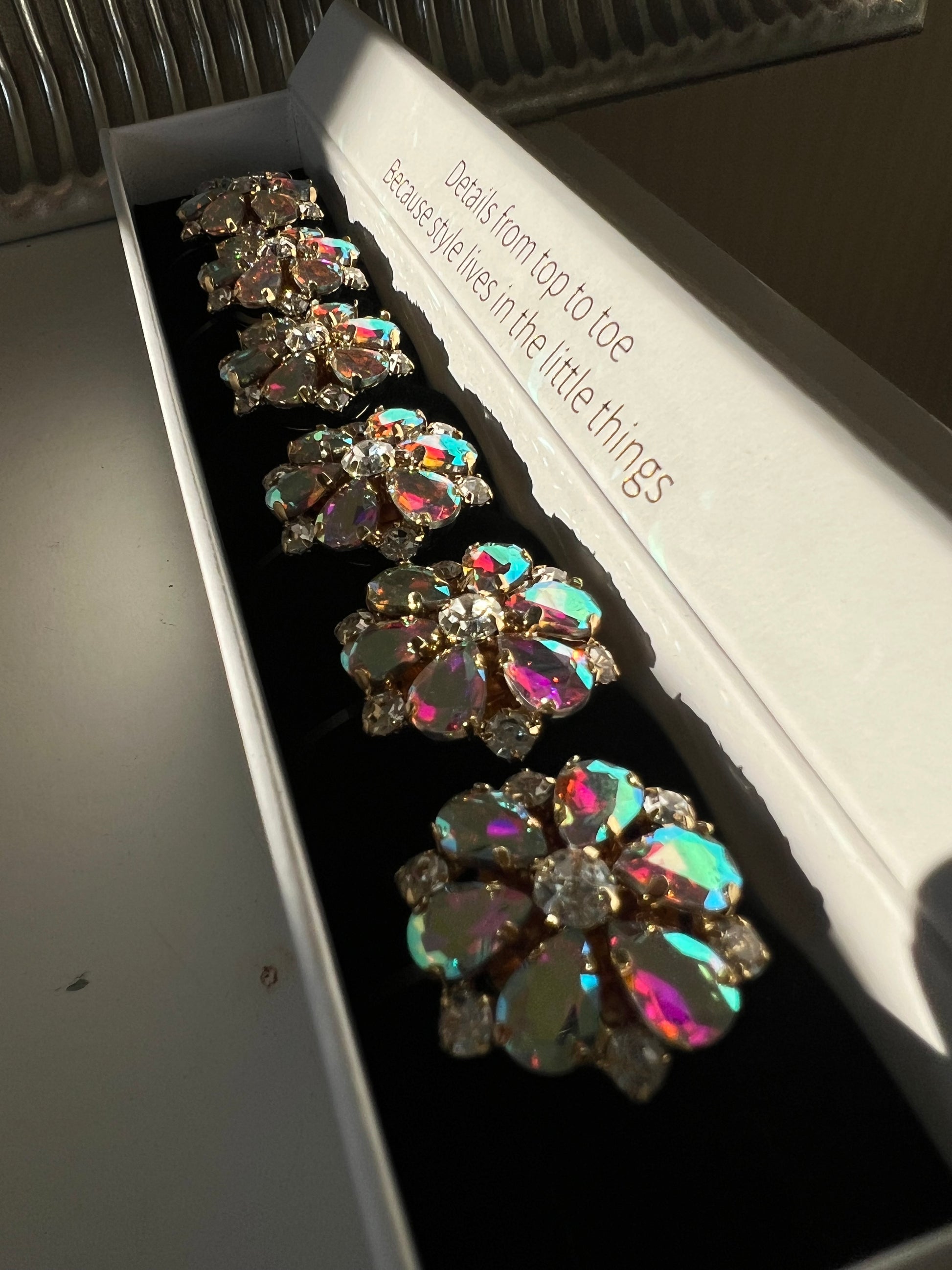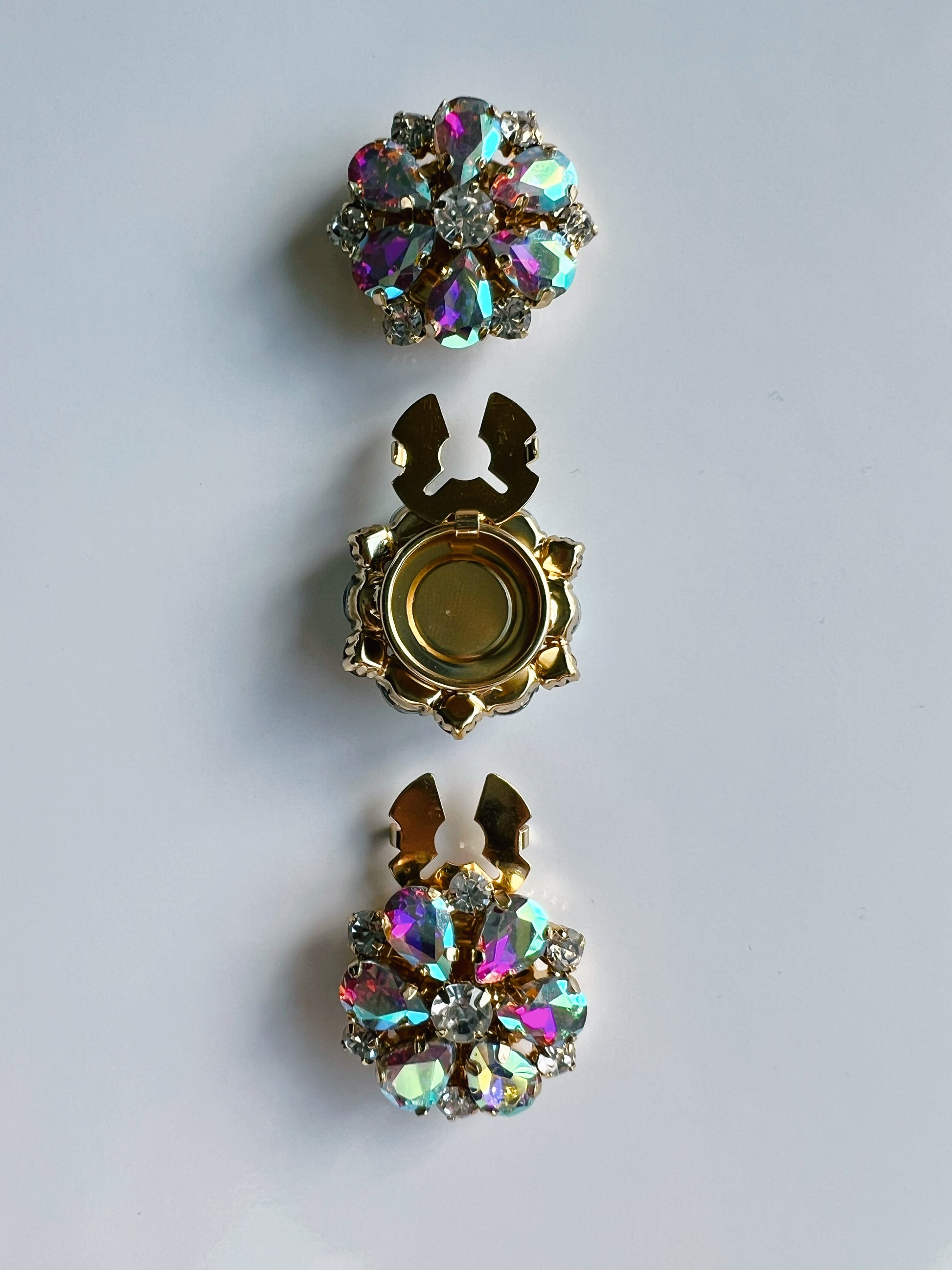 Emy is a flower-shaped button charm with six teardrop stones in shifting shades of lilac, green, and mirror-like shine – like an aurora in bloom. Tiny white stones between each petal and a larger center stone complete the look. The base is gold, and the name Emy comes from my grandmother’s middle name.