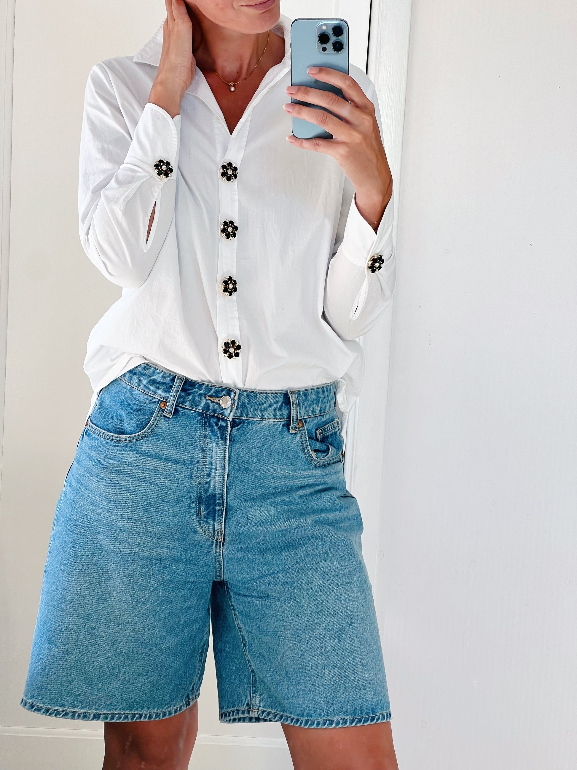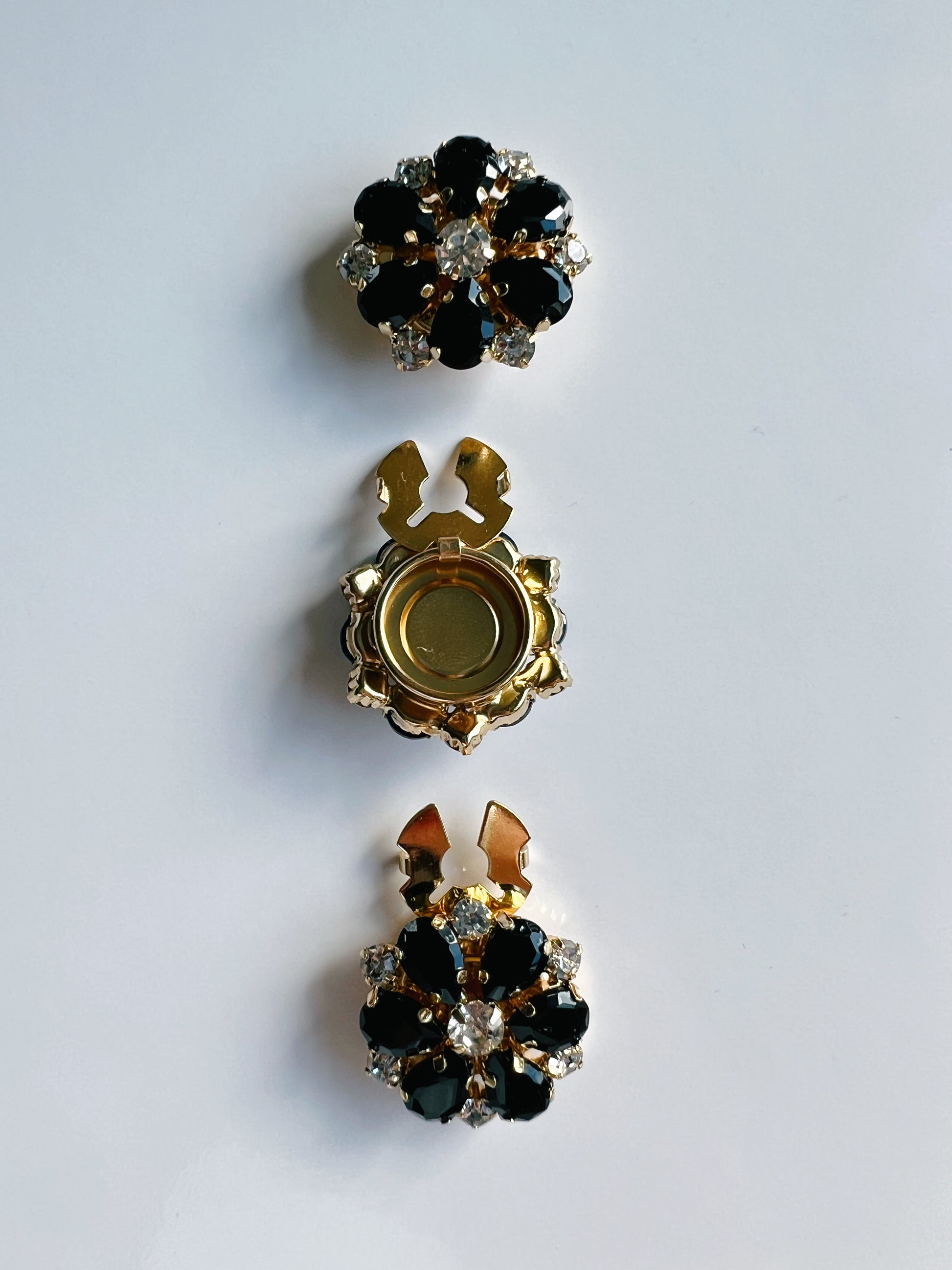 Maja is a flower-shaped button charm with six teardrop-shaped black stones as petals, smaller white accent stones in between, and a larger white center stone. The golden base highlights the contrast and adds a touch of refined elegance. Named after my great-grandmother – a woman of strength, warmth and character.
