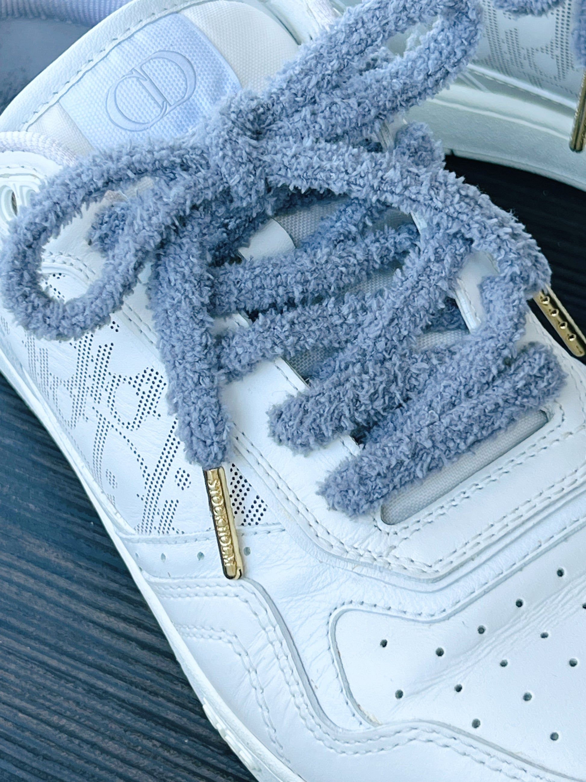 Grey Teddy Sample are our round, fluffy shoelaces in a soft grey tone with gold metal tips. The cozy teddy texture makes them a playful and unique upgrade to your sneakers or boots. Only 2 pairs exist – first come, first served!