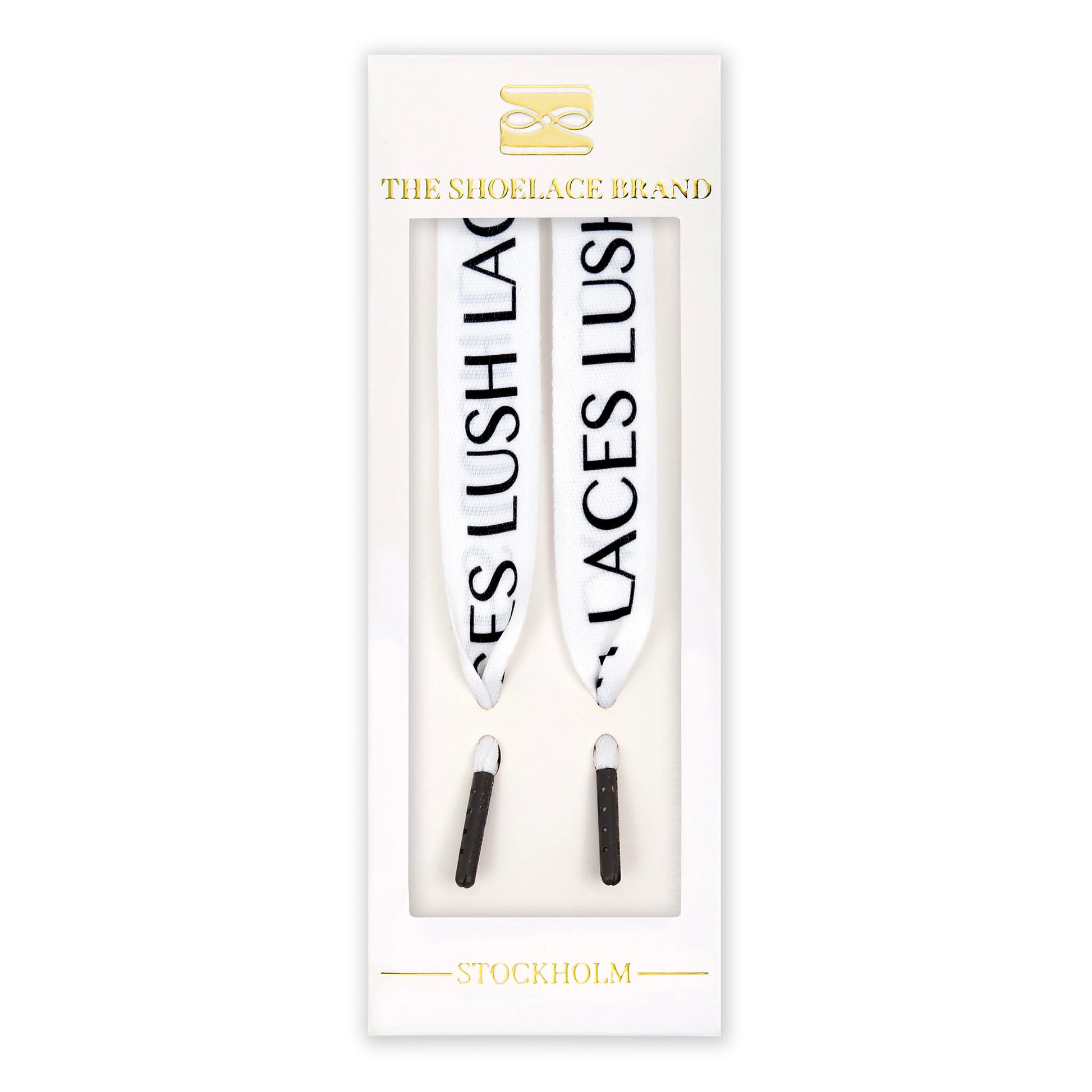 The Lush Lace shoelaces combine minimalism with a bold message. White satin ribbons printed with the words "LUSH LACES" in black and finished with sleek black metal tips – these laces are made to stand out without trying too hard.