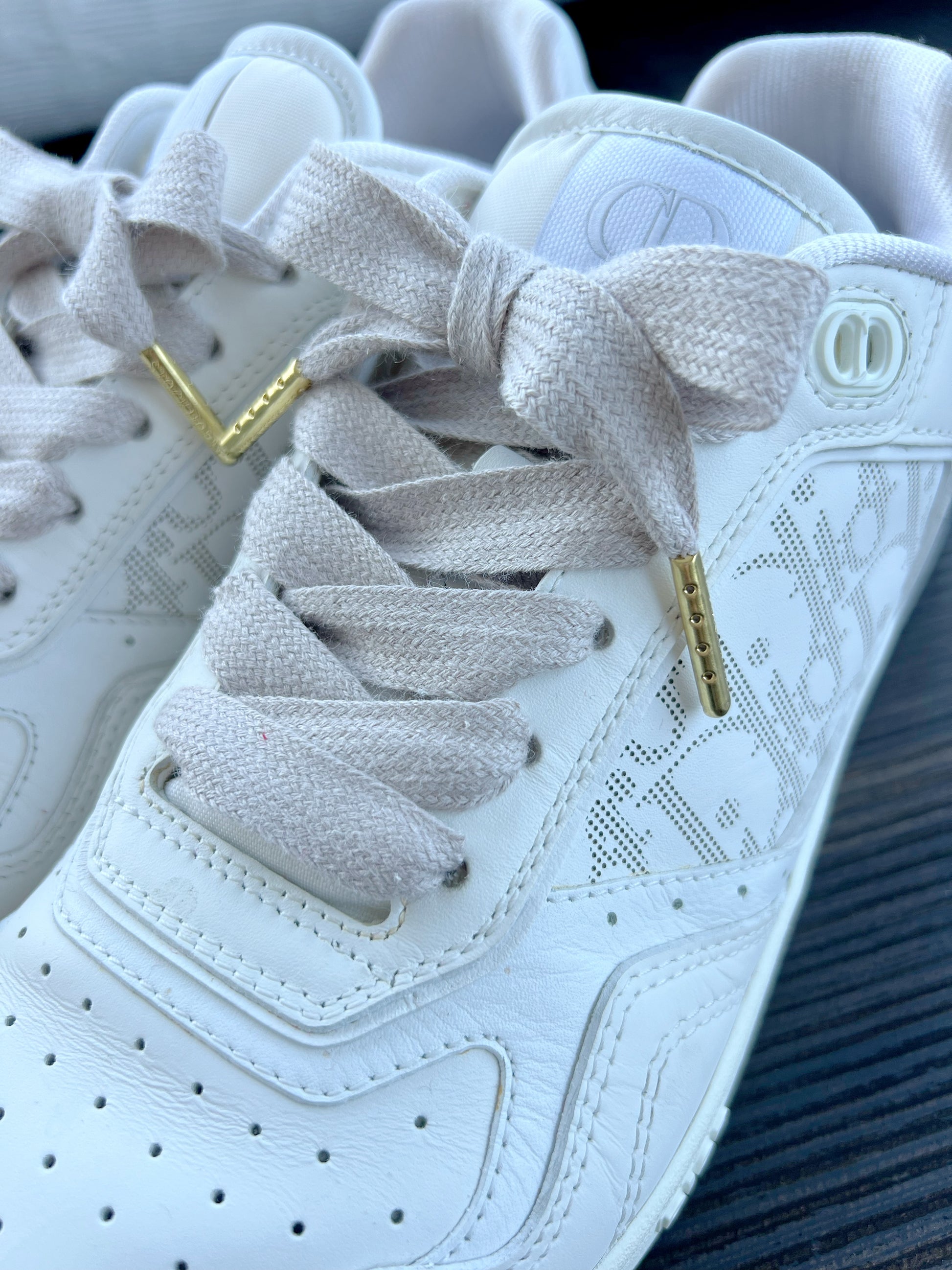 Beige Cotton Sample are our classic cotton shoelaces in a neutral beige tone. The matte texture gives a natural look while the gold metal tips add a touch of elegance. Measuring 1.5 cm wide and 100 cm long, they’re perfect for sneakers or shoes where you want subtle but stylish details. Only 2 pairs exist!